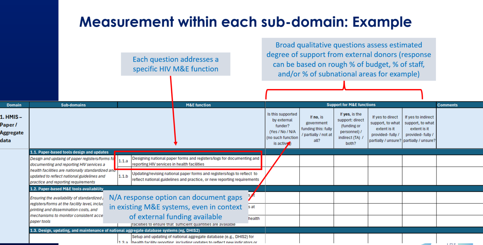 The tool – a questionnaire with a color-coded scoring system – allows countries to see at a glance which components of their M&E programs are currently supported by external donors and partners. For example, one set of questions assesses whether systems exist to routinely check, validate, and improve data quality.